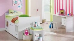 Een extra hoge instaphoogte met Kajuitbed Jesse hoog. Voor de wat grotere kinderen/tieners is dat sowieso erg prettig. Maar ook de wat avonturierlijkere kinderen zullen hier helemaal weg van zijn. Daarnaast heeft dit bed ook nog een hoop extra opbergruimte. Dit bed wordt geleverd zonder matras en bedbodem (rolbodem en spiraalbodem niet mogelijk).