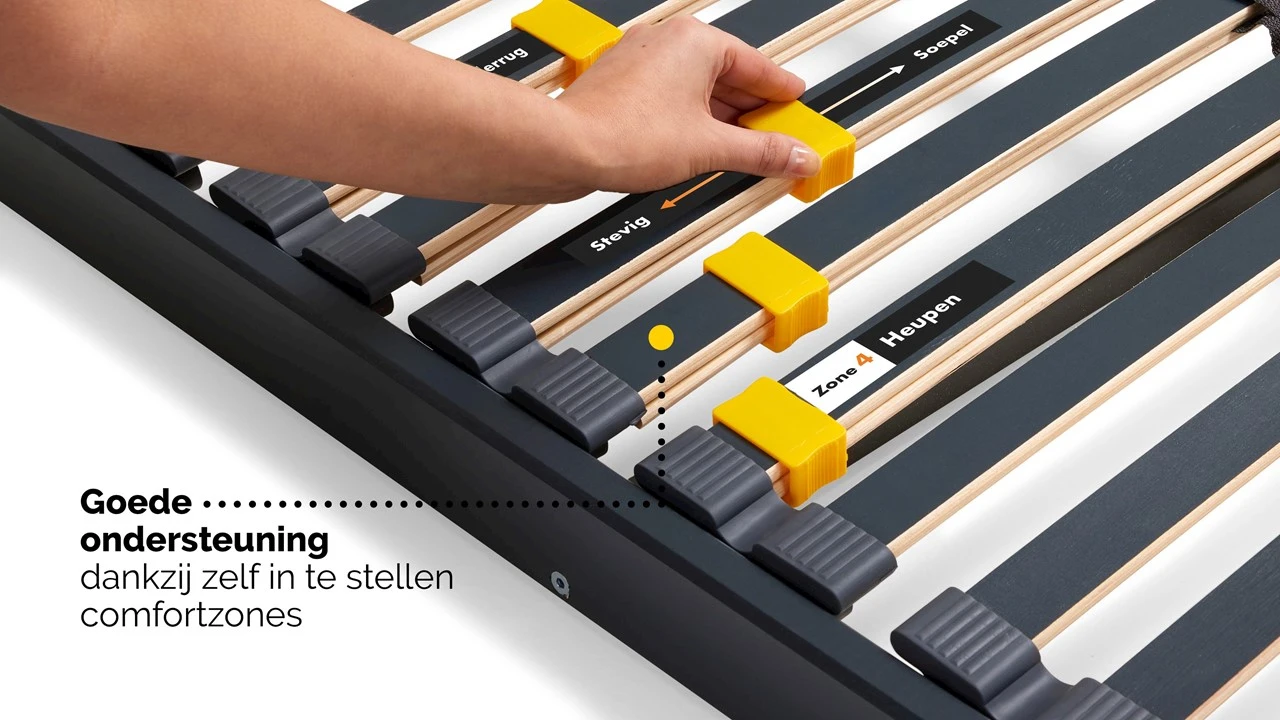 Met lattenbodem Bossflex 400 vlak van het eigen merk Beter Bed Basic kies je voor een solide, beukenhouten lattenbodem. In vergelijking met lattenbodem Bossflex 200 vlak zorgt deze lattenbodem voor extra ondersteuning bij de heup- en schouderzone door de comfortzones en kun je eenvoudig met het schuif-mechanisme de hardheid van de bodem naar eigen wens aanpassen. Doordat je zelf kunt bepalen waar je extra steun en veerkracht wenst, biedt de bodem je extra veel ligcomfort.
